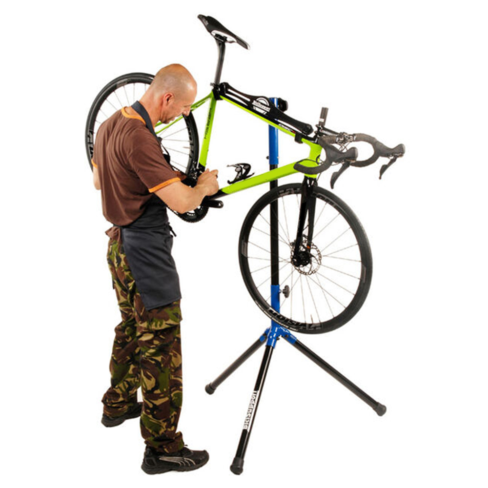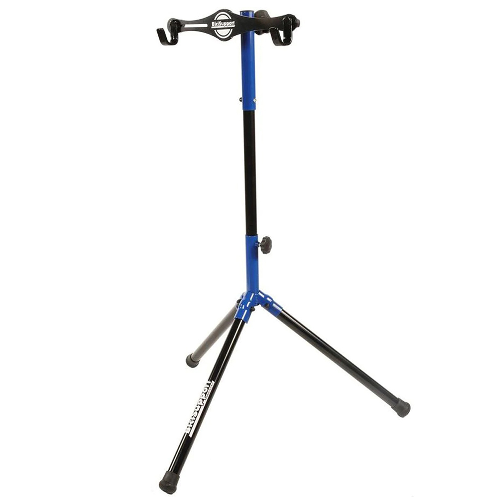 Soporte plegable para limpieza y trabajos de mantenimiento en la bici. Permite arreglar la bicicleta gracias a dos ganchos giratorios.